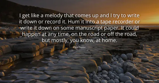 Taylor, Paul. "I get like a melody that comes up and I try to write it down or record it. Hum it into a tape recorder or write it down on some manuscript paper. It could happen at any time, on the road or off the road, but mostly, you know, at home." FixQuotes. January 16, 2026. https://fixquotes.com/quotes/i-get-like-a-melody-that-comes-up-and-i-try-to-134371/.