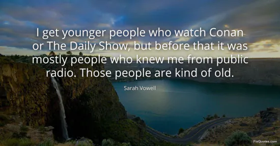 Vowell, Sarah. "I get younger people who watch Conan or The Daily Show, but before that it was mostly people who knew me from public radio. Those people are kind of old." FixQuotes. January 16, 2026. https://fixquotes.com/quotes/i-get-younger-people-who-watch-conan-or-the-daily-107041/.