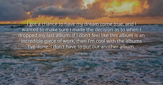 Daddy, Puff. "I got a chance to have my dream come true, and I wanted to make sure I made the decision as to when I dropped my last album. If I don't feel like this album is an incredible piece of work, then I'm cool with the albums I've done. I don't have to put out another album." FixQuotes. January 16, 2026. https://fixquotes.com/quotes/i-got-a-chance-to-have-my-dream-come-true-and-i-115821/.