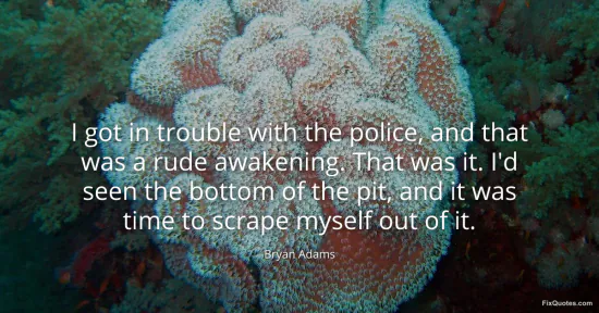 Adams, Bryan. "I got in trouble with the police, and that was a rude awakening. That was it. I'd seen the bottom of the pit, and it was time to scrape myself out of it." FixQuotes. January 17, 2026. https://fixquotes.com/quotes/i-got-in-trouble-with-the-police-and-that-was-a-48436/.