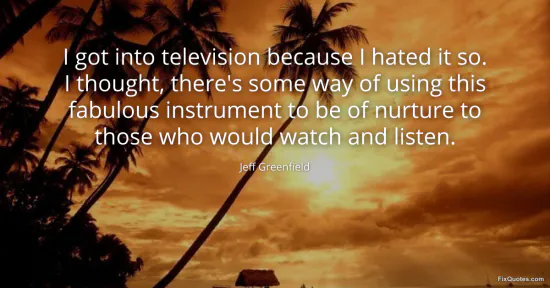 Greenfield, Jeff. "I got into television because I hated it so. I thought, there's some way of using this fabulous instrument to be of nurture to those who would watch and listen." FixQuotes. January 16, 2026. https://fixquotes.com/quotes/i-got-into-television-because-i-hated-it-so-i-126002/.