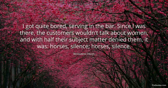 Devlin, Bernadette. (2026, January 15). I got quite bored, serving in the bar. Since I was there, the customers wouldn't talk about women, and with half their subject matter denied them, it was: horses, silence; horses, silence. FixQuotes. https://fixquotes.com/quotes/i-got-quite-bored-serving-in-the-bar-since-i-was-157790/