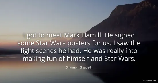 Elizabeth, Shannon. "I got to meet Mark Hamill. He signed some Star Wars posters for us. I saw the fight scenes he had. He was really into making fun of himself and Star Wars." FixQuotes. January 16, 2026. https://fixquotes.com/quotes/i-got-to-meet-mark-hamill-he-signed-some-star-102220/.