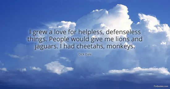 Dale, Dick. (2026, January 17). I grew a love for helpless, defenseless things. People would give me lions and jaguars. I had cheetahs, monkeys. FixQuotes. https://fixquotes.com/quotes/i-grew-a-love-for-helpless-defenseless-things-52425/