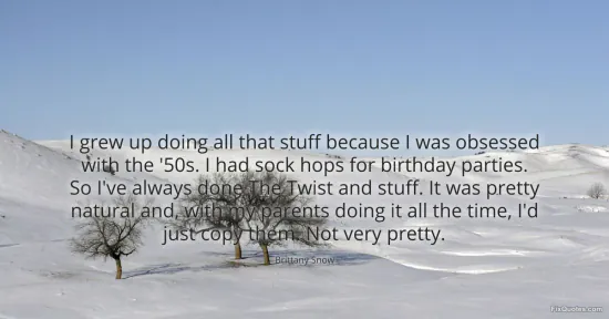 Snow, Brittany. "I grew up doing all that stuff because I was obsessed with the '50s. I had sock hops for birthday parties. So I've always done The Twist and stuff. It was pretty natural and, with my parents doing it all the time, I'd just copy them. Not very pretty." FixQuotes. January 16, 2026. https://fixquotes.com/quotes/i-grew-up-doing-all-that-stuff-because-i-was-98902/.