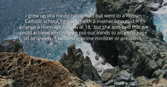Nooyi, Indra. (2026, January 15). I grew up in a Hindu household but went to a Roman Catholic school. I grew up with a mother who said, 'I'll arrange a marriage for you at 18,' but she also said that we could achieve anything we put our minds to an encourage us to dream of becoming prime minister or president. FixQuotes. https://fixquotes.com/quotes/i-grew-up-in-a-hindu-household-but-went-to-a-146878/