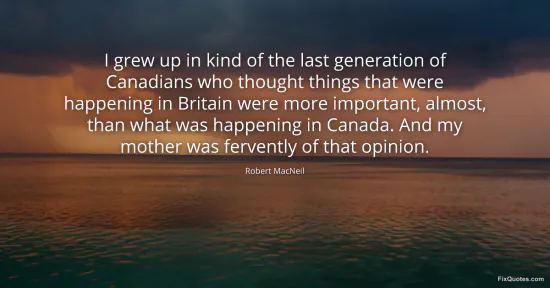 MacNeil, Robert. "I grew up in kind of the last generation of Canadians who thought things that were happening in Britain were more important, almost, than what was happening in Canada. And my mother was fervently of that opinion." FixQuotes. January 15, 2026. https://fixquotes.com/quotes/i-grew-up-in-kind-of-the-last-generation-of-77025/.