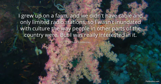 Klosterman, Chuck. (2026, January 17). I grew up on a farm, and we didn't have cable and only limited radio stations, so I wasn't inundated with culture the way people in other parts of the country were. But I was really interested in it. FixQuotes. https://fixquotes.com/quotes/i-grew-up-on-a-farm-and-we-didnt-have-cable-and-42250/