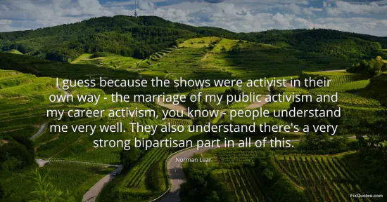 Lear, Norman. (2026, January 15). I guess because the shows were activist in their own way - the marriage of my public activism and my career activism, you know - people understand me very well. They also understand there's a very strong bipartisan part in all of this. FixQuotes. https://fixquotes.com/quotes/i-guess-because-the-shows-were-activist-in-their-156901/