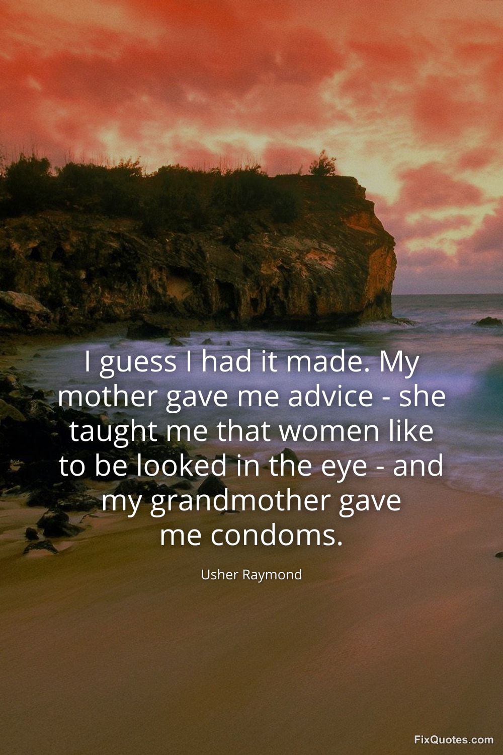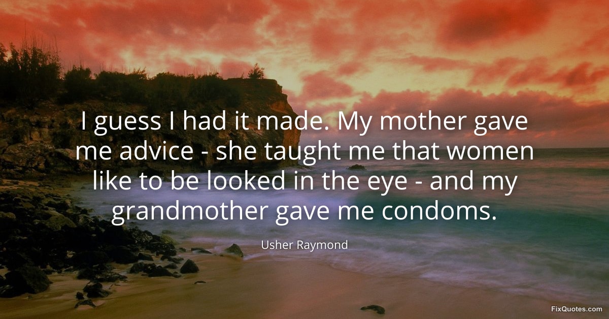 Raymond, Usher. (2026, January 16). I guess I had it made. My mother gave me advice - she taught me that women like to be looked in the eye - and my grandmother gave me condoms. FixQuotes. https://fixquotes.com/quotes/i-guess-i-had-it-made-my-mother-gave-me-advice-104321/