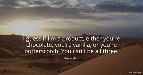 Mars, Bruno. (2026, February 16). I guess if I'm a product, either you're chocolate, you're vanilla, or you're butterscotch. You can't be all three. FixQuotes. https://fixquotes.com/quotes/i-guess-if-im-a-product-either-youre-chocolate-128224/