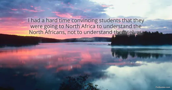 "I had a hard time convincing students that they were going to North Africa to understand the North Africans, not to understand themselves." FixQuotes, 15 Jan. 2026, https://fixquotes.com/quotes/i-had-a-hard-time-convincing-students-that-they-145668/. Accessed 12 Feb. 2026.