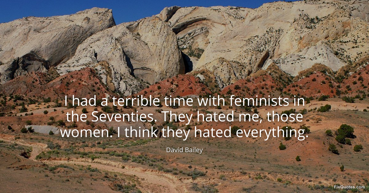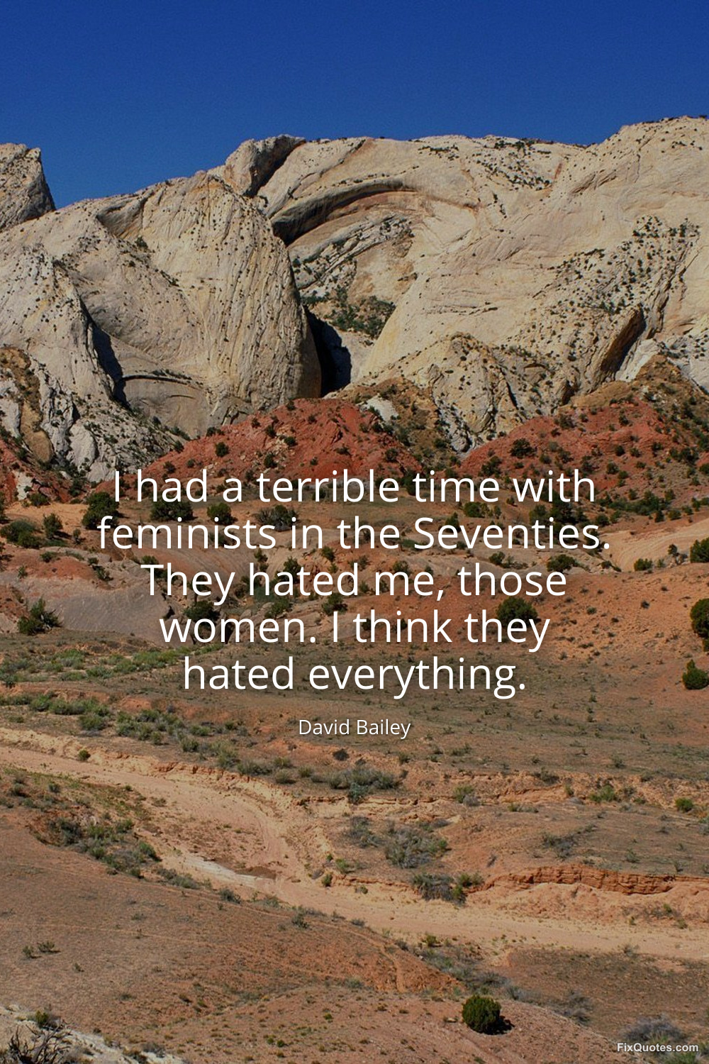 Bailey, David. (2026, March 23). I had a terrible time with feminists in the Seventies. They hated me, those women. I think they hated everything. FixQuotes. https://fixquotes.com/quotes/i-had-a-terrible-time-with-feminists-in-the-186288/