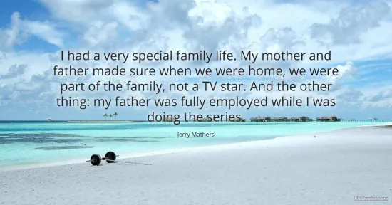 Mathers, Jerry. "I had a very special family life. My mother and father made sure when we were home, we were part of the family, not a TV star. And the other thing: my father was fully employed while I was doing the series." FixQuotes. January 16, 2026. https://fixquotes.com/quotes/i-had-a-very-special-family-life-my-mother-and-117715/.
