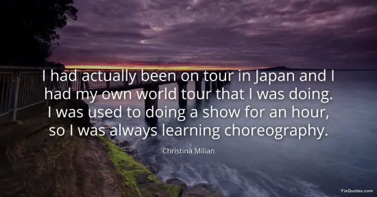 Milian, Christina. (2026, January 17). I had actually been on tour in Japan and I had my own world tour that I was doing. I was used to doing a show for an hour, so I was always learning choreography. FixQuotes. https://fixquotes.com/quotes/i-had-actually-been-on-tour-in-japan-and-i-had-my-49986/