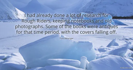 Berenger, Tom. "I had already done a lot of research for Rough Riders, keeping notebooks and old photographs. Some of the books were antiques for that time period, with the covers falling off." FixQuotes. January 15, 2026. https://fixquotes.com/quotes/i-had-already-done-a-lot-of-research-for-rough-151525/.