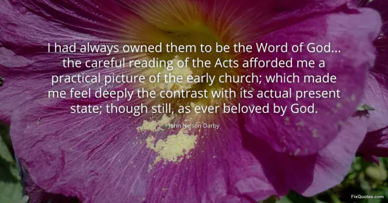 Darby, John Nelson. "I had always owned them to be the Word of God... the careful reading of the Acts afforded me a practical picture of the early church; which made me feel deeply the contrast with its actual present state; though still, as ever beloved by God." FixQuotes. January 18, 2026. https://fixquotes.com/quotes/i-had-always-owned-them-to-be-the-word-of-god-the-10454/.
