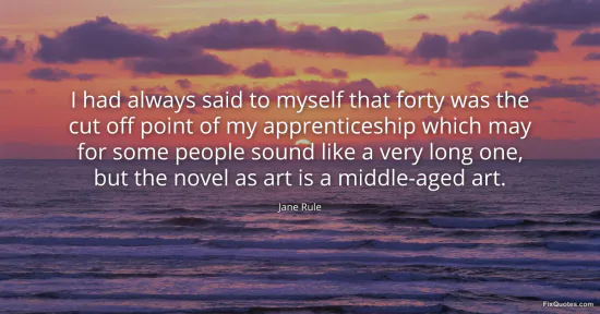 Rule, Jane. "I had always said to myself that forty was the cut off point of my apprenticeship which may for some people sound like a very long one, but the novel as art is a middle-aged art." FixQuotes. January 16, 2026. https://fixquotes.com/quotes/i-had-always-said-to-myself-that-forty-was-the-113060/.