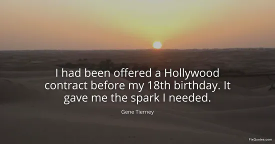 Tierney, Gene. "I had been offered a Hollywood contract before my 18th birthday. It gave me the spark I needed." FixQuotes. January 17, 2026. https://fixquotes.com/quotes/i-had-been-offered-a-hollywood-contract-before-my-60041/.