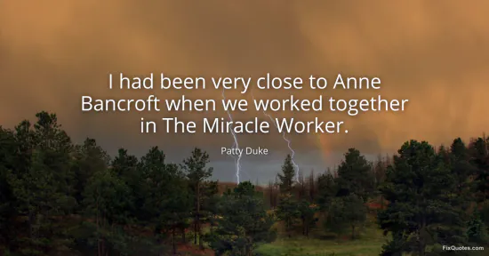 Duke, Patty. (2026, January 15). I had been very close to Anne Bancroft when we worked together in The Miracle Worker. FixQuotes. https://fixquotes.com/quotes/i-had-been-very-close-to-anne-bancroft-when-we-86661/
