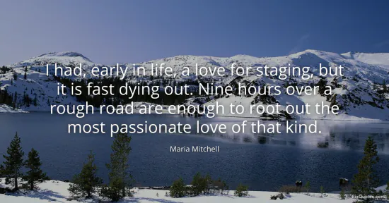 Mitchell, Maria. "I had, early in life, a love for staging, but it is fast dying out. Nine hours over a rough road are enough to root out the most passionate love of that kind." FixQuotes. January 16, 2026. https://fixquotes.com/quotes/i-had-early-in-life-a-love-for-staging-but-it-is-129917/.