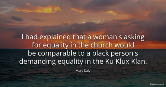 Daly, Mary. "I had explained that a woman's asking for equality in the church would be comparable to a black person's demanding equality in the Ku Klux Klan." FixQuotes. January 16, 2026. https://fixquotes.com/quotes/i-had-explained-that-a-womans-asking-for-equality-88040/.