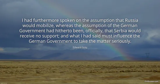 Grey, Edward. (2026, January 17). I had furthermore spoken on the assumption that Russia would mobilize, whereas the assumption of the German Government had hitherto been, officially, that Serbia would receive no support; and what I had said must influence the German Government to take the matter seriously. FixQuotes. https://fixquotes.com/quotes/i-had-furthermore-spoken-on-the-assumption-that-70376/