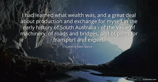 Spence, Catherine Helen. "I had learned what wealth was, and a great deal about production and exchange for myself in the early history of South Australia - of the value of machinery, of roads and bridges, and of ports for transport and export." FixQuotes. January 17, 2026. https://fixquotes.com/quotes/i-had-learned-what-wealth-was-and-a-great-deal-44545/.