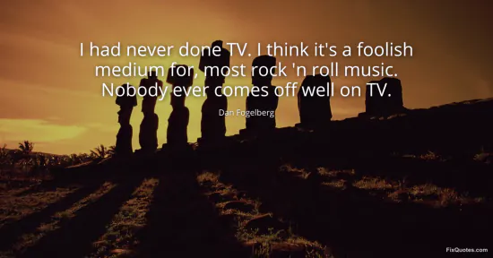 Fogelberg, Dan. (2026, January 16). I had never done TV. I think it's a foolish medium for, most rock 'n roll music. Nobody ever comes off well on TV. FixQuotes. https://fixquotes.com/quotes/i-had-never-done-tv-i-think-its-a-foolish-medium-110686/