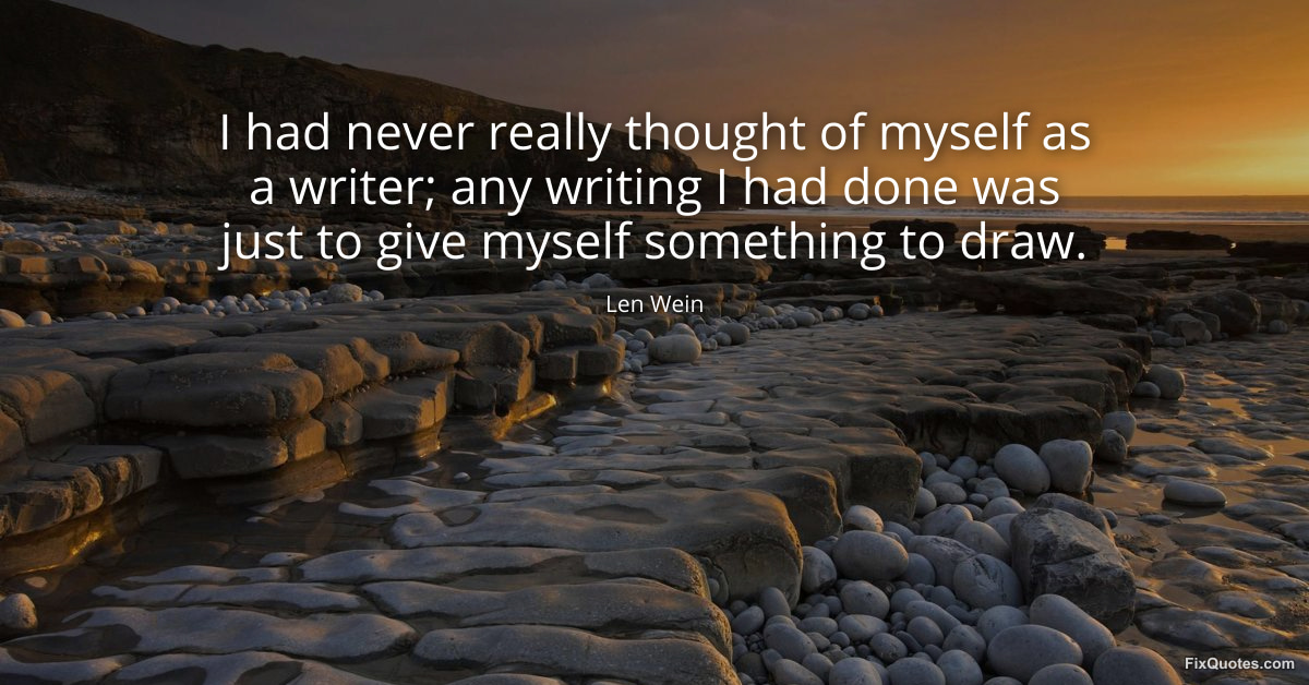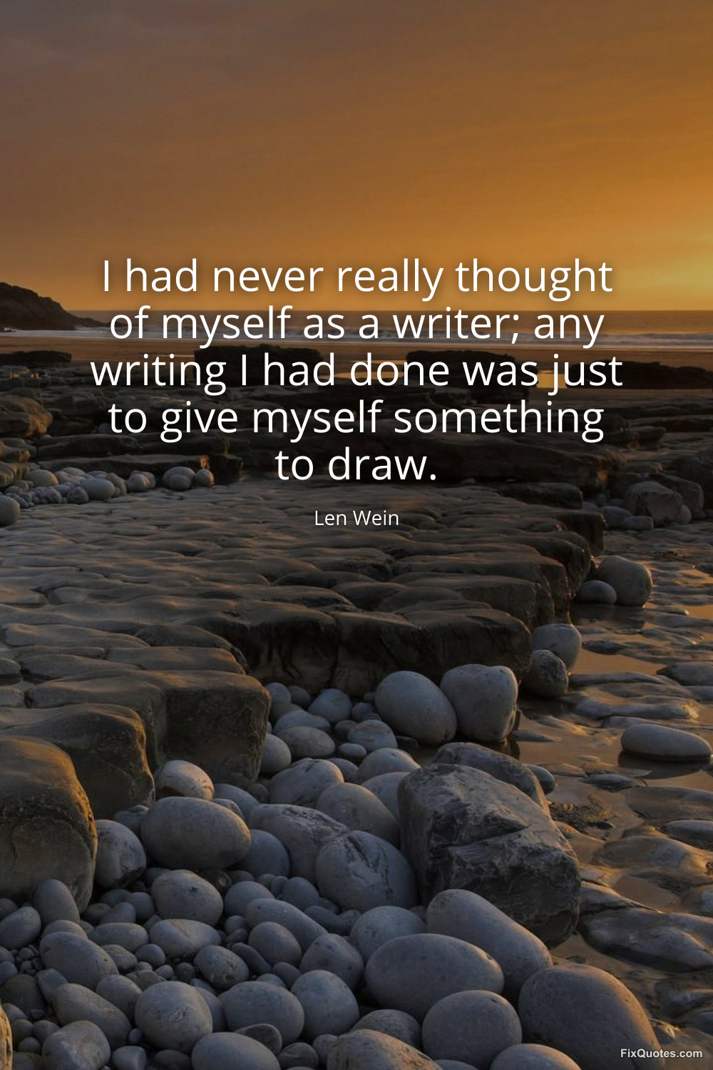 Wein, Len. "I had never really thought of myself as a writer; any writing I had done was just to give myself something to draw." FixQuotes. January 17, 2026. https://fixquotes.com/quotes/i-had-never-really-thought-of-myself-as-a-writer-60719/.