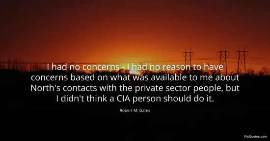 Gates, Robert M. "I had no concerns - I had no reason to have concerns based on what was available to me about North's contacts with the private sector people, but I didn't think a CIA person should do it." FixQuotes. January 16, 2026. https://fixquotes.com/quotes/i-had-no-concerns-i-had-no-reason-to-have-102790/.