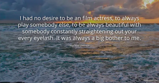 Dietrich, Marlene. "I had no desire to be an film actress, to always play somebody else, to be always beautiful with somebody constantly straightening out your every eyelash. It was always a big bother to me." FixQuotes. January 15, 2026. https://fixquotes.com/quotes/i-had-no-desire-to-be-an-film-actress-to-always-108180/.