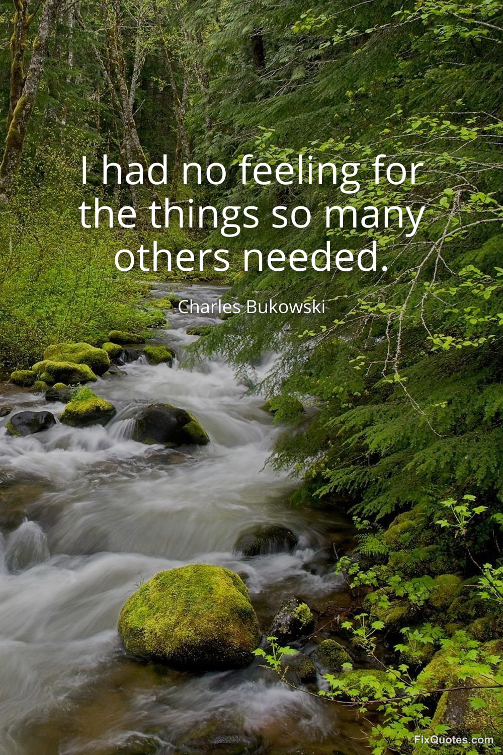 Bukowski, Charles. (2026, February 10). I had no feeling for the things so many others needed. FixQuotes. https://fixquotes.com/quotes/i-had-no-feeling-for-the-things-so-many-others-185212/