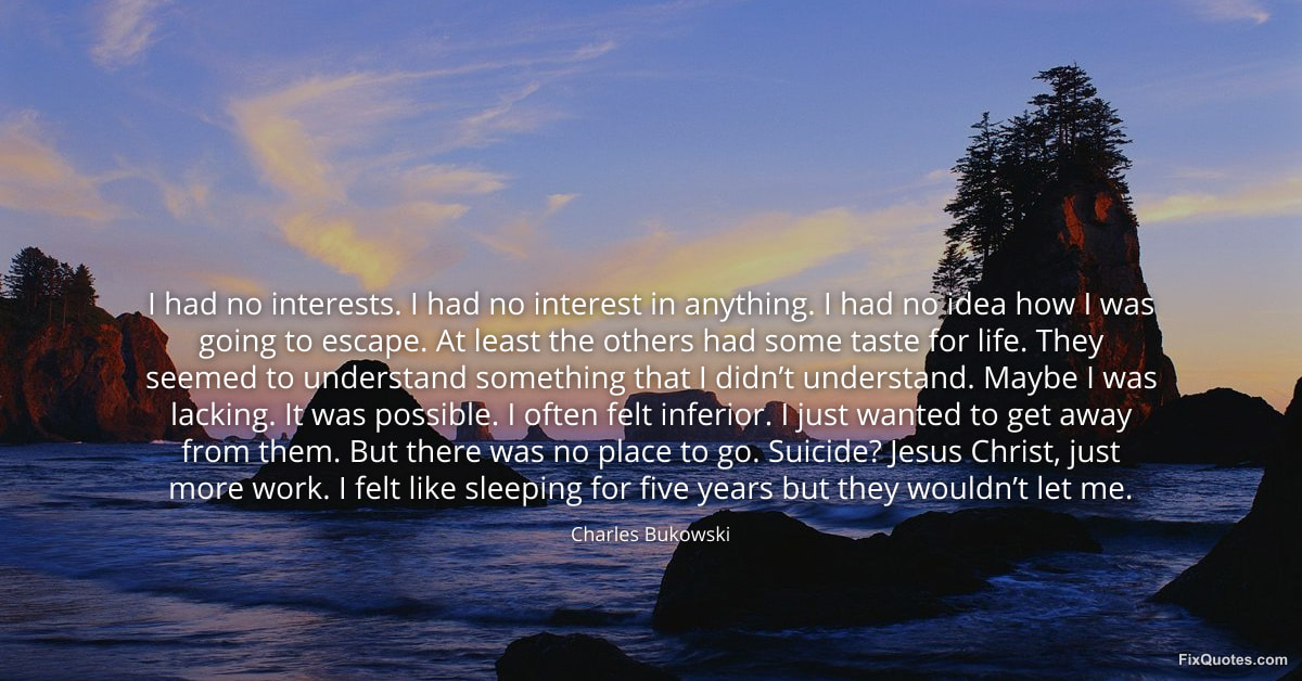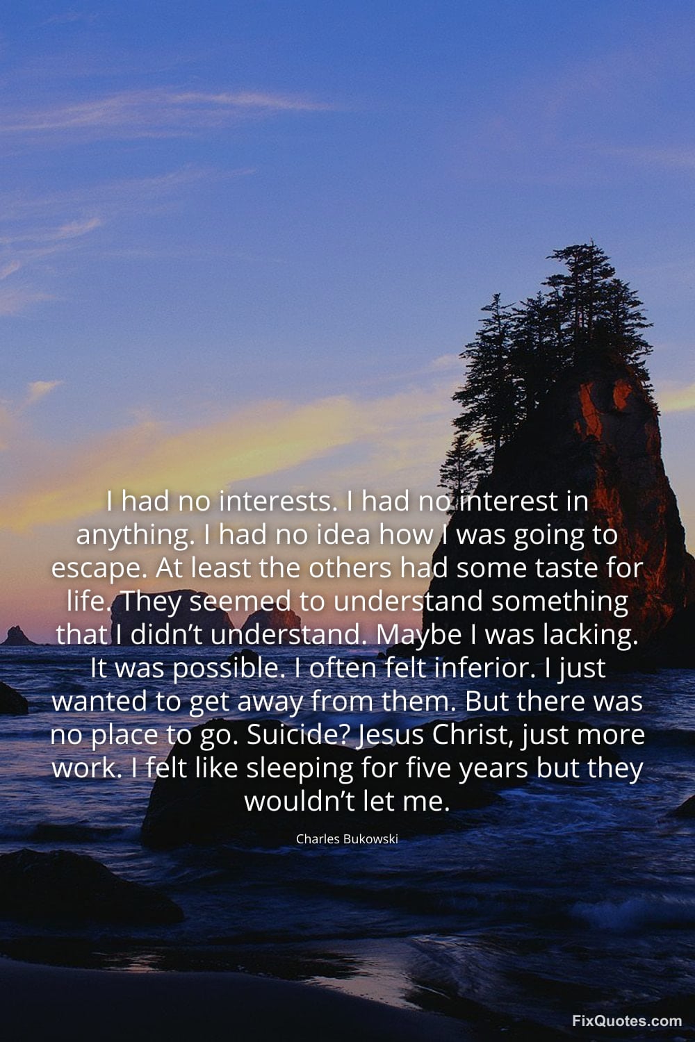 Bukowski, Charles. "I had no interests. I had no interest in anything. I had no idea how I was going to escape. At least the others had some taste for life. They seemed to understand something that I didn’t understand. Maybe I was lacking. It was possible. I often felt inferior. I just wanted to get away from them. But there was no place to go. Suicide? Jesus Christ, just more work. I felt like sleeping for five years but they wouldn’t let me." FixQuotes. February 10, 2026. https://fixquotes.com/quotes/i-had-no-interests-i-had-no-interest-in-anything-185213/.