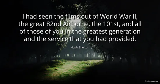 Shelton, Hugh. (2026, January 17). I had seen the films out of World War II, the great 82nd Airborne, the 101st, and all of those of you in the greatest generation and the service that you had provided. FixQuotes. https://fixquotes.com/quotes/i-had-seen-the-films-out-of-world-war-ii-the-48564/
