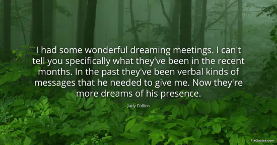 Collins, Judy. (2026, January 17). I had some wonderful dreaming meetings. I can't tell you specifically what they've been in the recent months. In the past they've been verbal kinds of messages that he needed to give me. Now they're more dreams of his presence. FixQuotes. https://fixquotes.com/quotes/i-had-some-wonderful-dreaming-meetings-i-cant-54348/