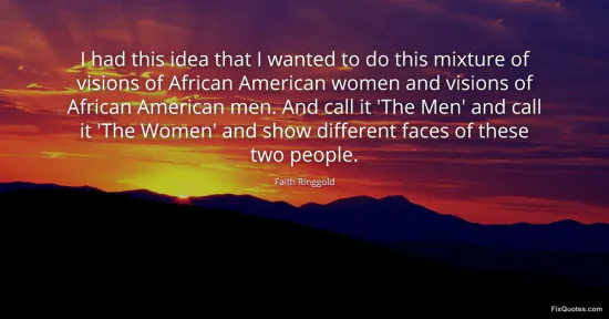 Ringgold, Faith. (2026, January 17). I had this idea that I wanted to do this mixture of visions of African American women and visions of African American men. And call it 'The Men' and call it 'The Women' and show different faces of these two people. FixQuotes. https://fixquotes.com/quotes/i-had-this-idea-that-i-wanted-to-do-this-mixture-47944/