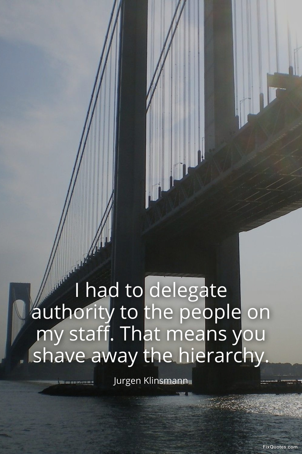 Klinsmann, Jurgen. "I had to delegate authority to the people on my staff. That means you shave away the hierarchy." FixQuotes. January 17, 2026. https://fixquotes.com/quotes/i-had-to-delegate-authority-to-the-people-on-my-69560/.
