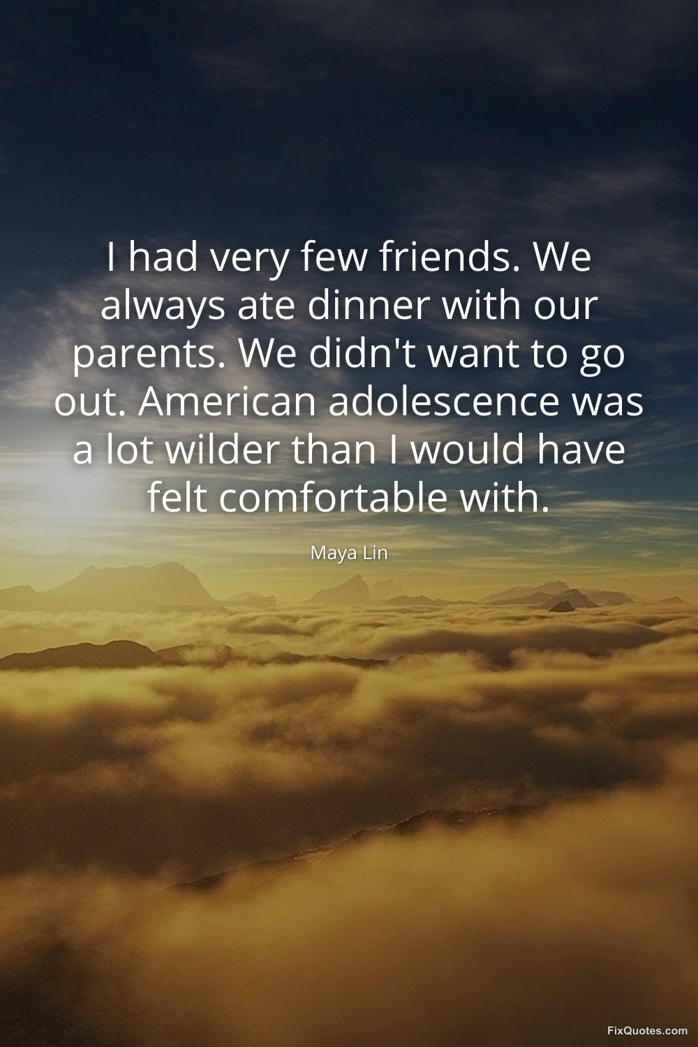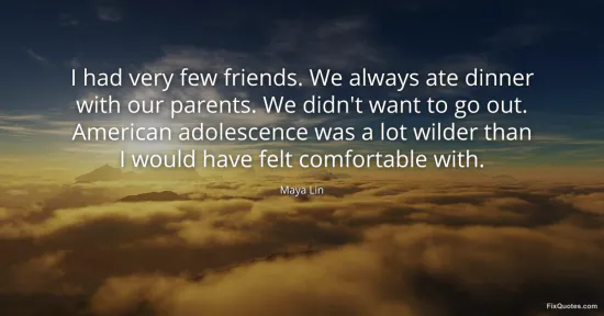 Lin, Maya. (2026, January 18). I had very few friends. We always ate dinner with our parents. We didn't want to go out. American adolescence was a lot wilder than I would have felt comfortable with. FixQuotes. https://fixquotes.com/quotes/i-had-very-few-friends-we-always-ate-dinner-with-6908/
