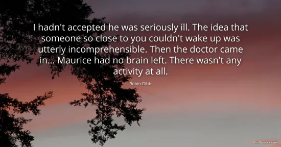 Gibb, Robin. "I hadn't accepted he was seriously ill. The idea that someone so close to you couldn't wake up was utterly incomprehensible. Then the doctor came in... Maurice had no brain left. There wasn't any activity at all." FixQuotes. January 15, 2026. https://fixquotes.com/quotes/i-hadnt-accepted-he-was-seriously-ill-the-idea-154069/.