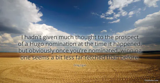 Egan, Greg. (2026, January 17). I hadn't given much thought to the prospect of a Hugo nomination at the time it happened, but obviously once you're nominated, winning one seems a bit less far-fetched than before. FixQuotes. https://fixquotes.com/quotes/i-hadnt-given-much-thought-to-the-prospect-of-a-53845/