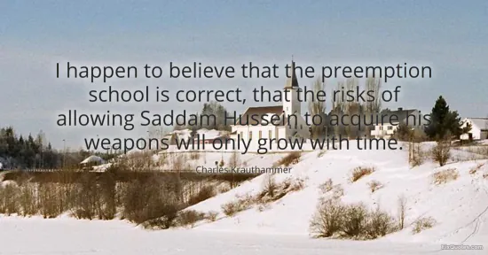 Krauthammer, Charles. (2026, January 16). I happen to believe that the preemption school is correct, that the risks of allowing Saddam Hussein to acquire his weapons will only grow with time. FixQuotes. https://fixquotes.com/quotes/i-happen-to-believe-that-the-preemption-school-is-139566/