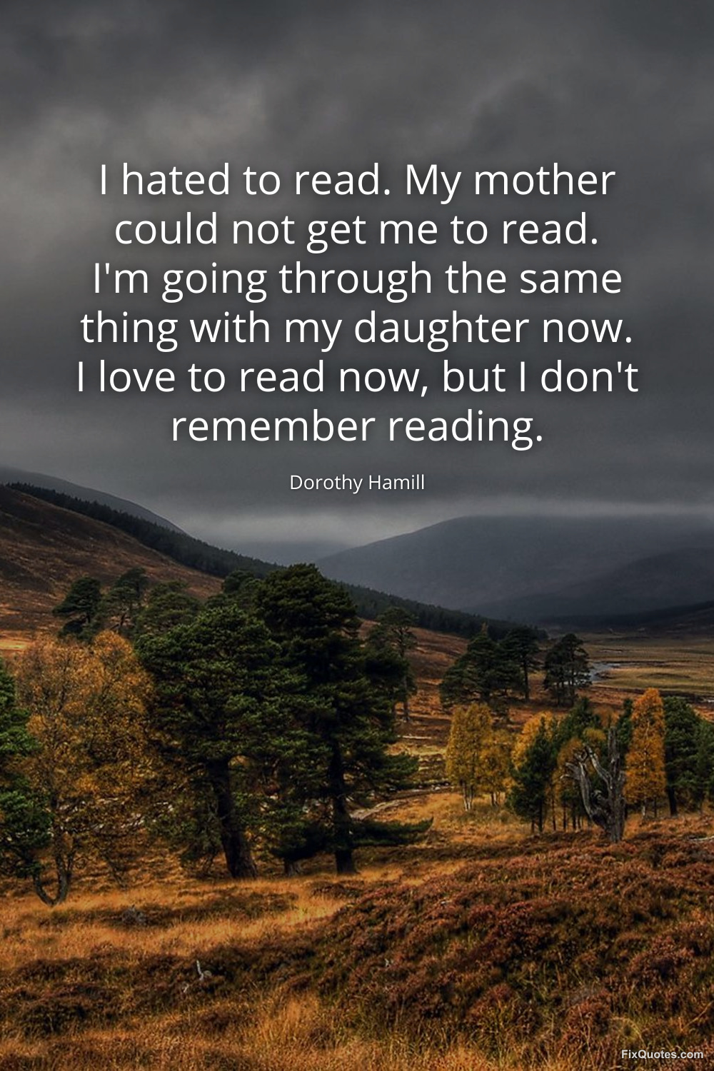 Hamill, Dorothy. (2026, January 16). I hated to read. My mother could not get me to read. I'm going through the same thing with my daughter now. I love to read now, but I don't remember reading. FixQuotes. https://fixquotes.com/quotes/i-hated-to-read-my-mother-could-not-get-me-to-111556/