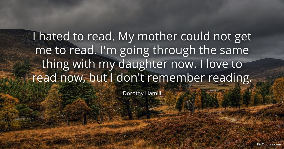 Hamill, Dorothy. "I hated to read. My mother could not get me to read. I'm going through the same thing with my daughter now. I love to read now, but I don't remember reading." FixQuotes. January 16, 2026. https://fixquotes.com/quotes/i-hated-to-read-my-mother-could-not-get-me-to-111556/.