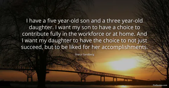 Sandberg, Sheryl. "I have a five year-old son and a three year-old daughter. I want my son to have a choice to contribute fully in the workforce or at home. And I want my daughter to have the choice to not just succeed, but to be liked for her accomplishments." FixQuotes. January 15, 2026. https://fixquotes.com/quotes/i-have-a-five-year-old-son-and-a-three-year-old-154798/.