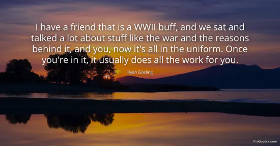 Gosling, Ryan. (2026, February 18). I have a friend that is a WWII buff, and we sat and talked a lot about stuff like the war and the reasons behind it, and you, now it's all in the uniform. Once you're in it, it usually does all the work for you. FixQuotes. https://fixquotes.com/quotes/i-have-a-friend-that-is-a-wwii-buff-and-we-sat-98713/