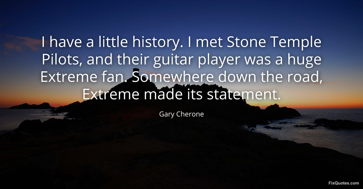 Cherone, Gary. (2026, January 15). I have a little history. I met Stone Temple Pilots, and their guitar player was a huge Extreme fan. Somewhere down the road, Extreme made its statement. FixQuotes. https://fixquotes.com/quotes/i-have-a-little-history-i-met-stone-temple-pilots-150650/