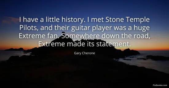 Cherone, Gary. "I have a little history. I met Stone Temple Pilots, and their guitar player was a huge Extreme fan. Somewhere down the road, Extreme made its statement." FixQuotes. January 15, 2026. https://fixquotes.com/quotes/i-have-a-little-history-i-met-stone-temple-pilots-150650/.