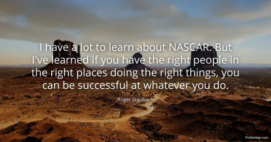 Staubach, Roger. "I have a lot to learn about NASCAR. But I've learned if you have the right people in the right places doing the right things, you can be successful at whatever you do." FixQuotes. January 16, 2026. https://fixquotes.com/quotes/i-have-a-lot-to-learn-about-nascar-but-ive-129026/.