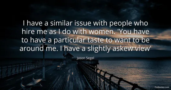 Segel, Jason. (2026, February 18). I have a similar issue with people who hire me as I do with women. 'You have to have a particular taste to want to be around me. I have a slightly askew view'. FixQuotes. https://fixquotes.com/quotes/i-have-a-similar-issue-with-people-who-hire-me-as-80261/